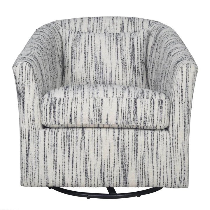 The CARMEN SWIVEL GLIDER is a stylish and comfortable chair that offers a smooth gliding motion and a convenient swivel feature, perfect for soothing relaxation and effortless maneuverability in any living space.