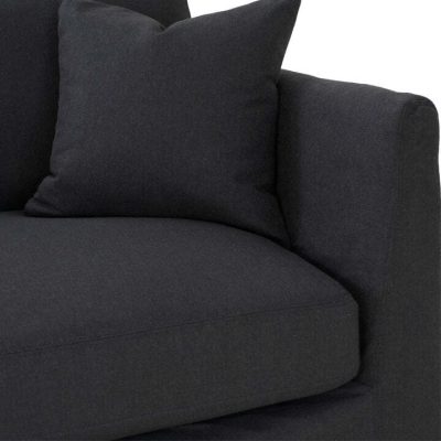 The Heston Sofa in black fabric combines sleek modern design with luxurious comfort, featuring a sophisticated black upholstery that effortlessly complements any contemporary living space. Its plush cushions and tailored silhouette create an inviting seating experience for both style and relaxation.