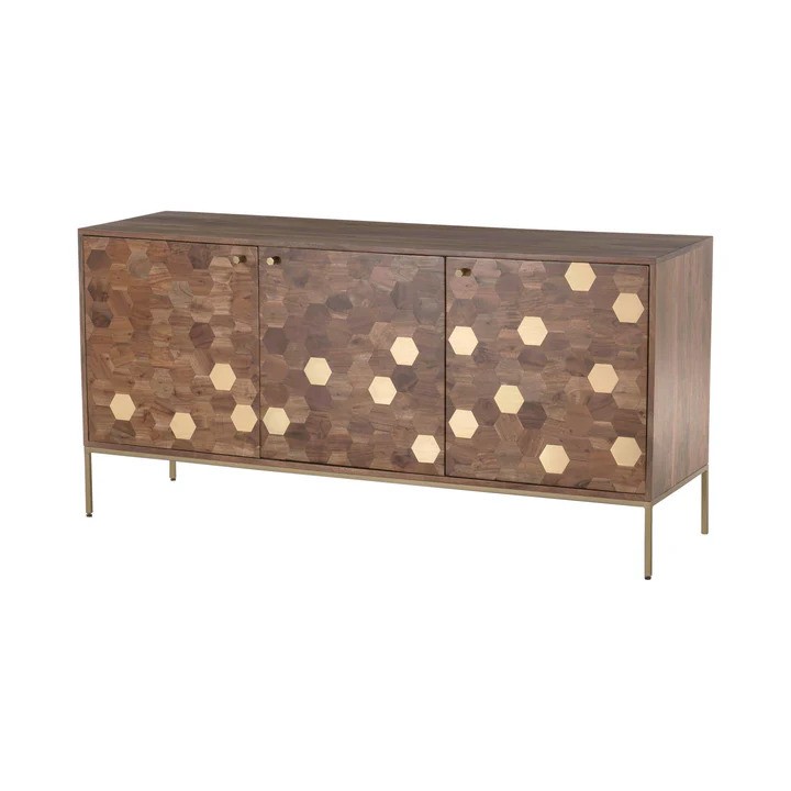 | Other Details | Hexagon brass inlay on door fronts Base/Legs: Metal with antique brass finish Finished Back: Yes (painted brown) |