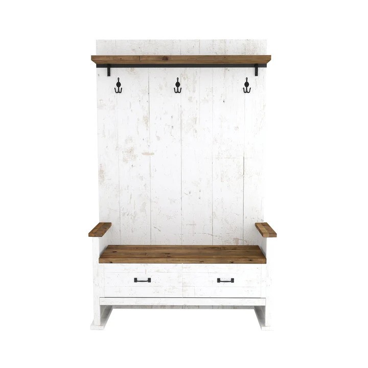 | Additional Dimensions | Clearance from floor: 7 Arm Rest: 3.25 x 14.5 x 8 Floor to top of arm rest: 27.5 Floor to bottom of hooks: 59 Bench to bottom of hooks: 40 Bench to bottom of shelf: 51 Top of shelf to top of back: 2.75 Shelf: 39 x 8 x 1 Leg width: 3.1 |