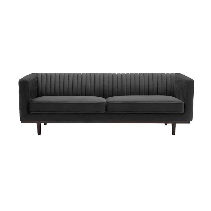 Introducing our luxurious Sage Sofa in sleek black velvet, blending timeless elegance with contemporary comfort for a sophisticated living space centerpiece.
